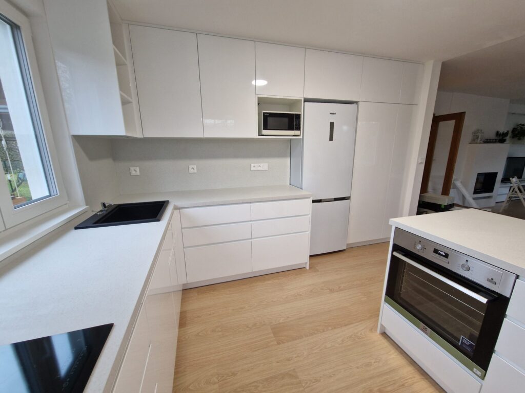 Stredná kategória (5 000 – 8 000 EUR) — L-tvar alebo väčšia rovná linka (3 – 4 m). MDF lakované dvierka alebo kvalitnejšie LTD dekory, kamenná alebo kompozitná pracovná doska, tlmené závesy a plnovýsuvy. Toto je najpopulárnejšia kategória — najlepší pomer ceny a kvality, ktorý pokrýva potreby väčšiny slovenských domácností.